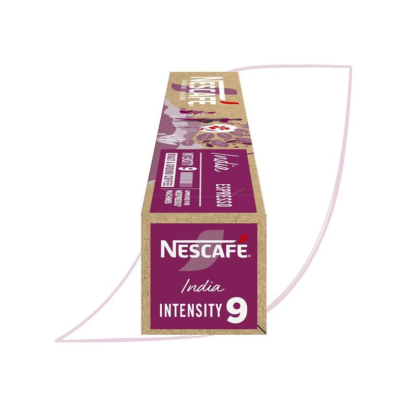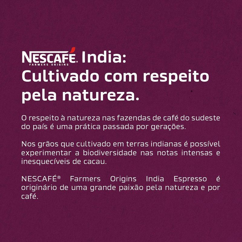 Nescafé Farmers Origins India - 10 cápsulas. Um café espresso com grãos do sudeste indiano escolhidos a mão e notas intensas de cacau. Intensidade: 9 Compatíveis com máquina Nespresso.