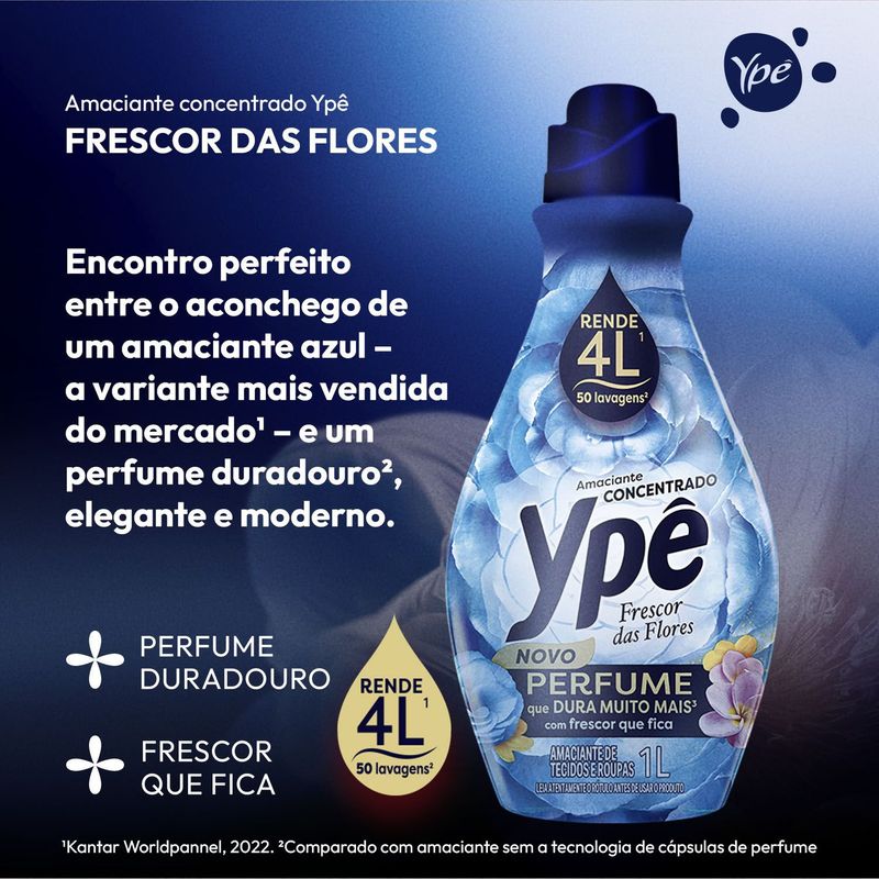 Amaciante Concentrado Ypê Blue possui tecnologia que realiza o tratamento das cores e cápsulas de perfume que são liberadas no momento da lavagem, liberando 4x mais perfumação. É maciez e perfume inigualáveis para toda a sua família.