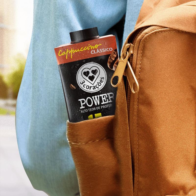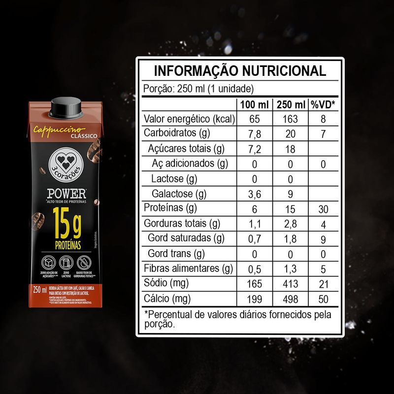 Bebida Láctea UHT 3 Corações Power Whey Zero Lactose 15g ProteínaCappuccino Clássico Caixa 250ml
