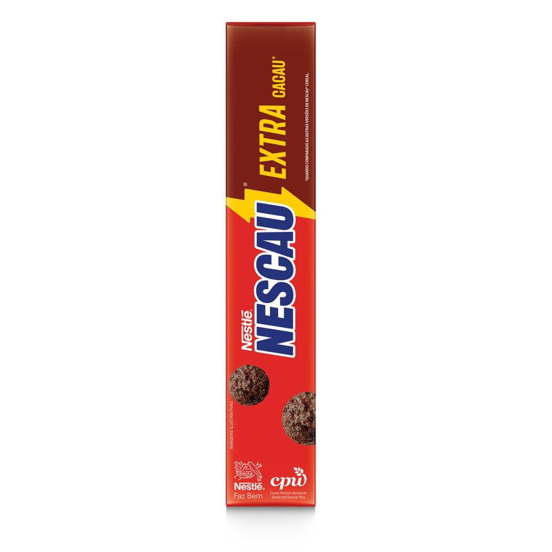 Extra cacau e extra sabor quando comparado as outras versões de NESCAU® CEREAL, NESTLÉ® NESCAU® EXTRA CACAU contém 8 nutrientes (vitaminas B1, B2, B3, B5, B6, B9, ferro e cálcio) e é super crocante - energia que dá gosto de viver.