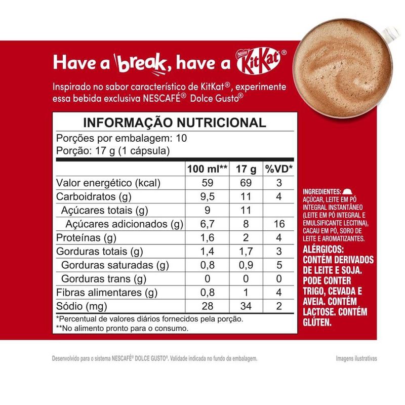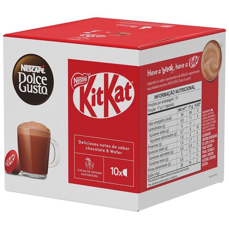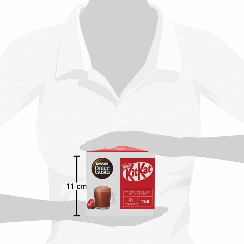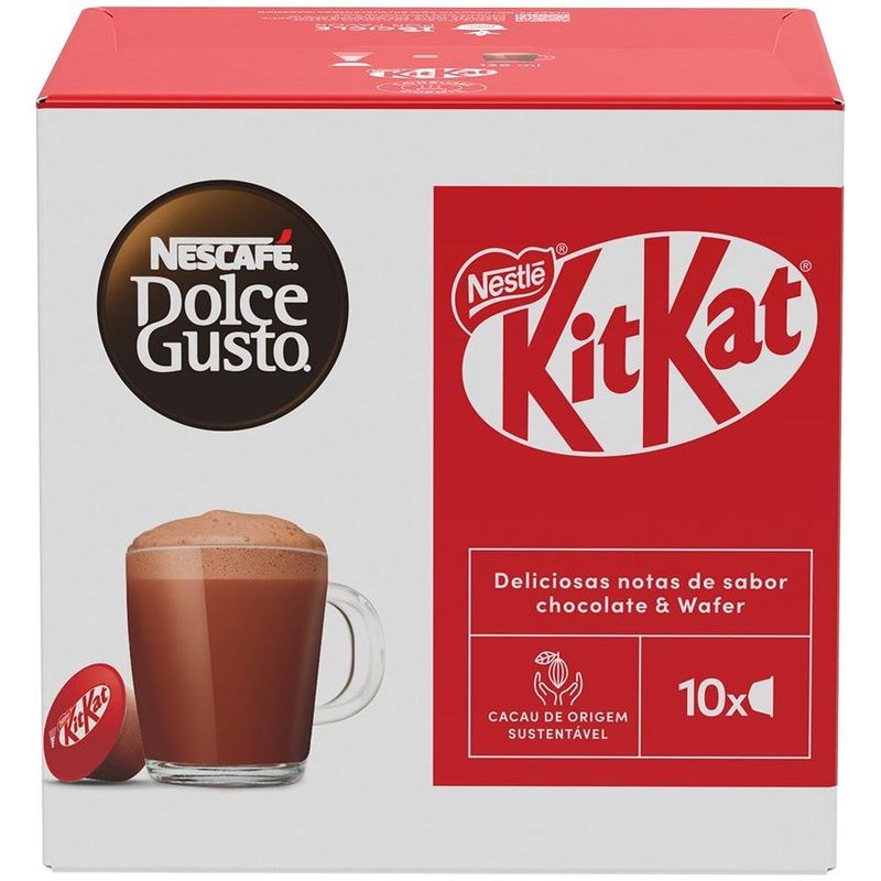 Aprecie um café delicioso e doce com o Café em Cápsula Nescafé Dolce Gusto KitKat 10 Cápsulas 170g. A combinação perfeita de café cremoso Nescafé e o sabor crocante e chocolatoso de KitKat. Em minutos, você prepara uma bebida deliciosa que traz a mistura equilibrada de café e chocolate, ideal para aqueles momentos de prazer. Prático e saboroso, com 10 cápsulas na embalagem, o Nescafé Dolce Gusto KitKat transforma qualquer pausa em um momento doce e aconchegante.
