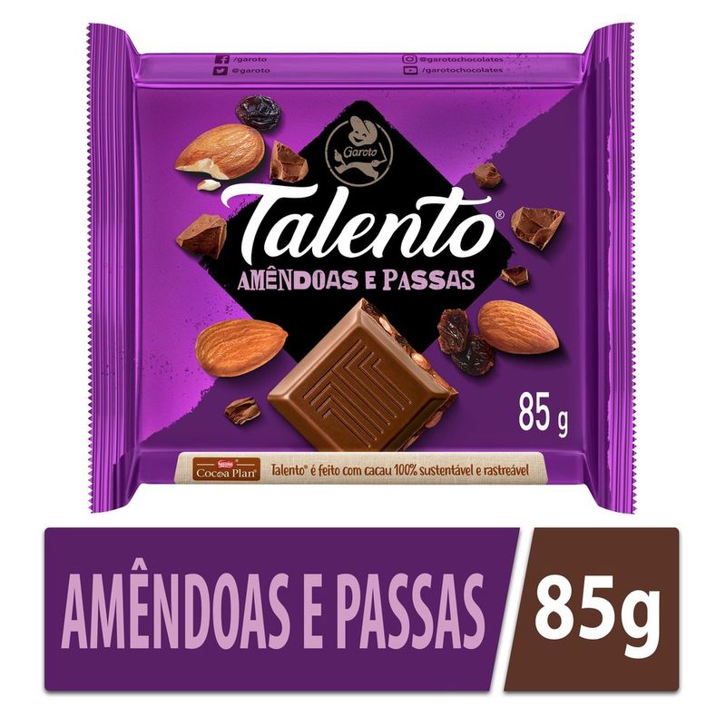 O Chocolate GAROTO TALENTO Amêndoas com Passas 85g mistura o chocolate ao leite Garoto com amêndoas crocantes e passas doces. Cada pedaço tem a suavidade do chocolate e a crocância das amêndoas, com o sabor doce das passas. É uma combinação deliciosa de sabores e texturas.