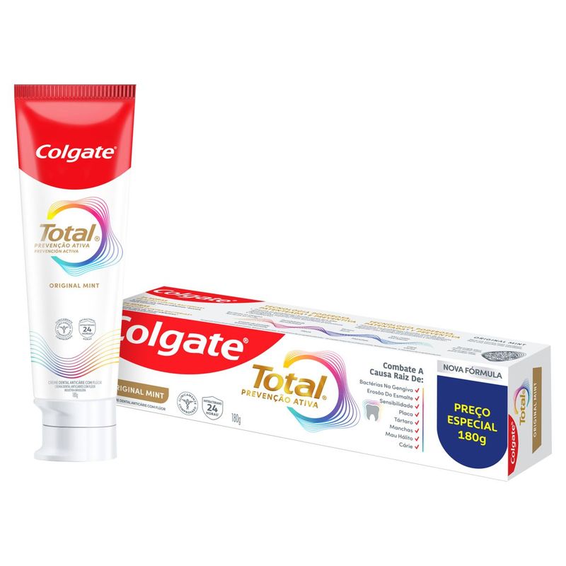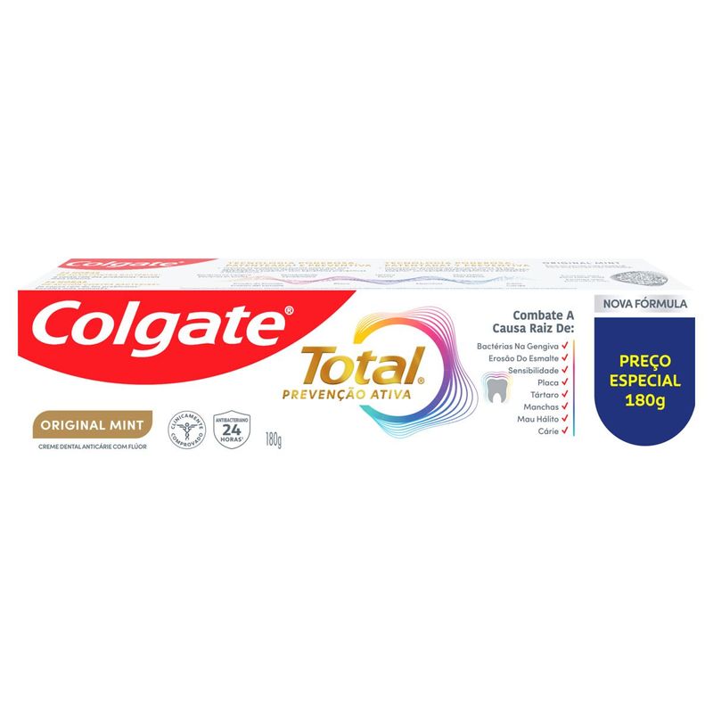 Colgate Total Original Mint, com prevenção ativa, é a escolha ideal para quem busca o melhor pasta de dente que combate a causa raiz dos problemas bucais***, antes que apareçam. O creme dental Colgate Total oferece 24 horas de proteção antibacteriana** e refrescância. Esta pasta de dente combate as bactérias que são a causa raiz de mau hálito, cáries, placa, tártaro e erosão do esmalte. O creme dental anticárie com flúor ajuda a limpar lugares difíceis de alcançar*. Seu uso regular ajuda a prevenir os problemas bucais mais comuns*** graças à sua fórmula com desempenho superior (em comparação a um creme dental normal com flúor sem ingrediente antibacteriano). A pasta Colgate Total tem prevenção de longa duração**, que ajuda a prevenir cáries e a fortalecer o esmalte. Para um cuidado ainda mais profundo, use Colgate Total Original Mint, prevenção ativa para uma limpeza profunda e proteção bucal completa. *vs apenas escovação. **Com escovação 2 vezes ao dia e uso contínuo durante 4 semanas. *** Ajuda a prevenir problemas bucais cosmeticos comuns causados por bacterias como: placa, cárie, tártaro e mau hálito.