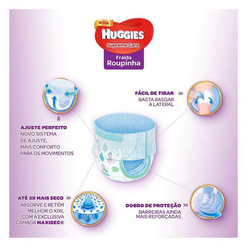 Quando comparada com a versão de tripla proteção fralda roupinha, a nova fralda tem formato anatômico que se adapta perfeitamente ao corpinho do bebê, sistema antivazamento duplamente reforçado e um novo desenho de cintura elástica que cobre melhor o corpinho do bebê, além de ser mais absorvente.