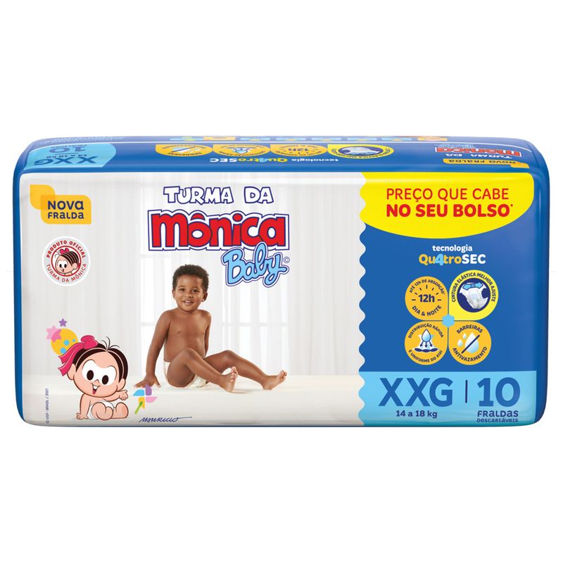 A Turma da Mônica Baby uniu proteção e conforto em uma nova opção de fralda, para garantir que seu bebê cresça feliz e tenha as melhores lembranças da sua infância. A Nova fralda Turma da Mônica Baby possui a nova Tecnologia QuatroSec para que ele fique calmo, tranquilo e seguro durante o dia e a noite toda. Conta com um exclusivo sistema de canais que distribui mais rápido o xixi, barreiras anti-vazamento e uma fina camada extra que ajuda a manter o bebê sequinho por até 12 horas, além de cintura elástica que proporciona um perfeito ajuste no corpinho.