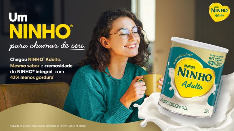 NINHO® ADULTO. UM LANÇAMENTO SURPREENDENTE! A sua marca do coração tem um lançamento inacreditável para você saborear o gostinho da infância fazendo escolhas mais saudáveis na vida adulta. NINHO® ADULTO une todo o sabor e a cremosidade do NINHO® LEITE INTEGRAL com incríveis 43% MENOS gorduras totais! Só provando para acreditar!