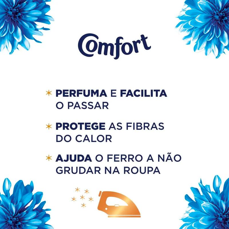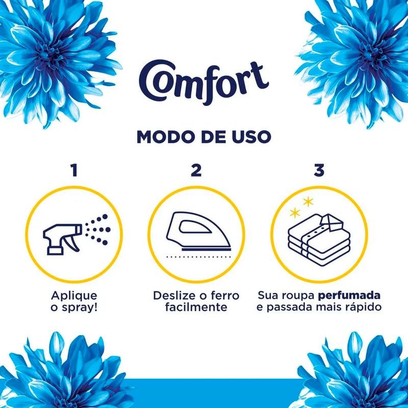 Passe Comfort é um Spray Facilitador para passar suas roupas. Ele é uma solução de passar 3 em 1 que protege as fibras do tecido do calor, tem um perfume suave e ajuda o ferro de passar a não grudar na roupa. Passe Comfort continua o mesmo produto, só está de “roupa” nova. Ele continua com os mesmos benefícios que já conhecemos: é um produto prático, eficiente e que dá aquela forcinha na hora de passar as roupas. Ideal para passar até as roupas com tecidos mais difíceis, sua fórmula com silicone é útil para obter uma melhor qualidade na hora de passar e além disso, reduz amassos, facilitando na hora de pendurar suas roupas. Basta aplicar diretamente nas roupas para incrível maciez no momento de passar roupa! Passe Comfort tem uma fragrância original, delicada e suave, é feito com ativos altamente eficazes que ajudam a desamarrotar as roupas e garante muito mais praticidade no dia a dia. Além dos incríveis benefícios de Passe Comfort, esse produto vem em um pulverizador de 500 ml, é indicado para roupas brancas e coloridas e dá um acabamento perfeito nelas. Você merece facilidade durante todo o dia, inclusive na hora de passar as roupas.