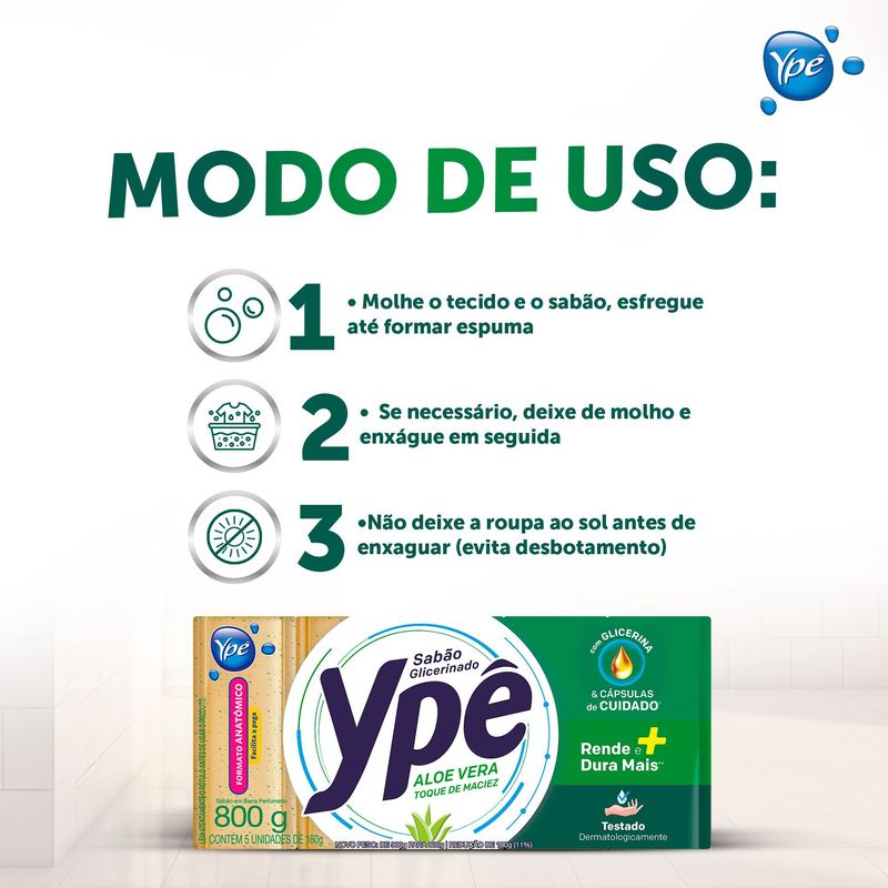 A clássica linha de Sabão em Barra Ypê conta com benefícios exclusivos em cada versão para atender todas as suas necessidades durante a limpeza de casa e das roupas. Cápsulas de Cuidado - Além de promover um cheiro de roupa limpa, ele conta com cápsulas de cuidado para toque de maciez e cuidado com as roupas. Versatilidade - Seja para limpar a casa, as roupas ou as louças, o Sabão em Barra Ypê oferece a praticidade que você precisa para tornar a sua rotina mais eficiente. Testado dermatologicamente - Todas as versões do Sabão em Barra Ype são glicerinadas e testadas dermatologicamente para um maior cuidado com a sua pele.