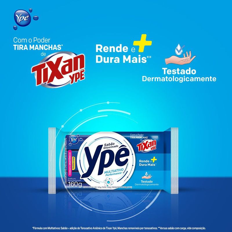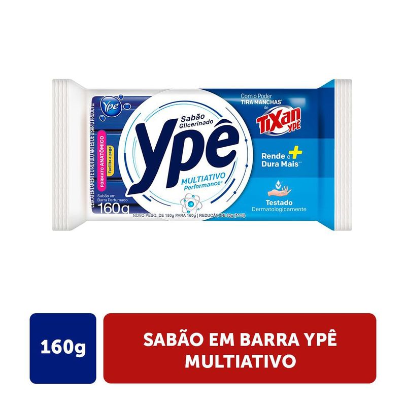 A clássica linha de Sabão em Barra Ypê conta com benefícios exclusivos em cada versão para atender todas as suas necessidades durante a limpeza de casa e das roupas. Poder tira manchas de Tixan - Fórmula com branqueador óptico, a mesma utilizada no Tira Manchas Tixan Ypê, que garante melhor resultado de brancura e alto poder de limpeza. Versatilidade - Seja para limpar a casa, as roupas ou as louças, o Sabão em Barra Ypê oferece a praticidade que você precisa para tornar a sua rotina mais eficiente. Testado dermatologicamente - Todas as versões do Sabão em Barra Ype são glicerinadas e testadas dermatologicamente para um maior cuidado com a sua pele.
