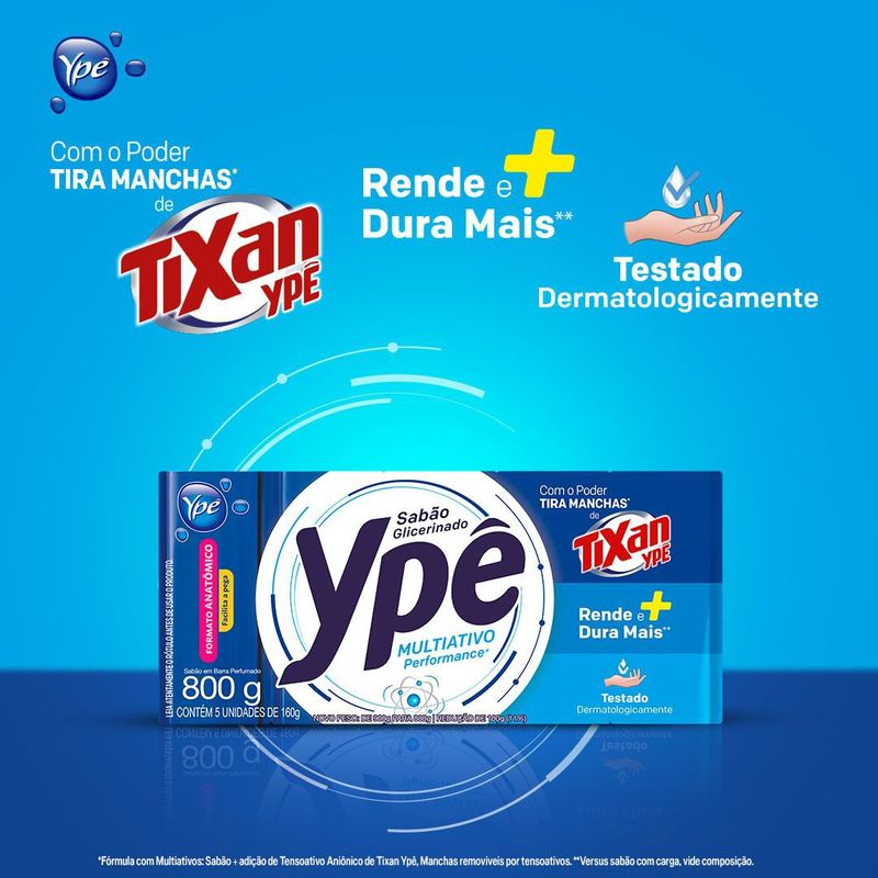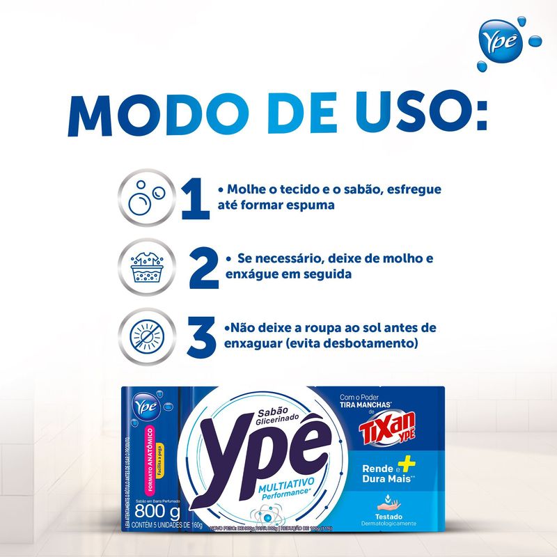 A clássica linha de Sabão em Barra Ypê conta com benefícios exclusivos em cada versão para atender todas as suas necessidades durante a limpeza de casa e das roupas. Poder tira manchas de Tixan - Fórmula com branqueador óptico, a mesma utilizada no Tira Manchas Tixan Ypê, que garante melhor resultado de brancura e alto poder de limpeza. Versatilidade - Seja para limpar a casa, as roupas ou as louças, o Sabão em Barra Ypê oferece a praticidade que você precisa para tornar a sua rotina mais eficiente. Testado dermatologicamente - Todas as versões do Sabão em Barra Ype são glicerinadas e testadas dermatologicamente para um maior cuidado com a sua pele.