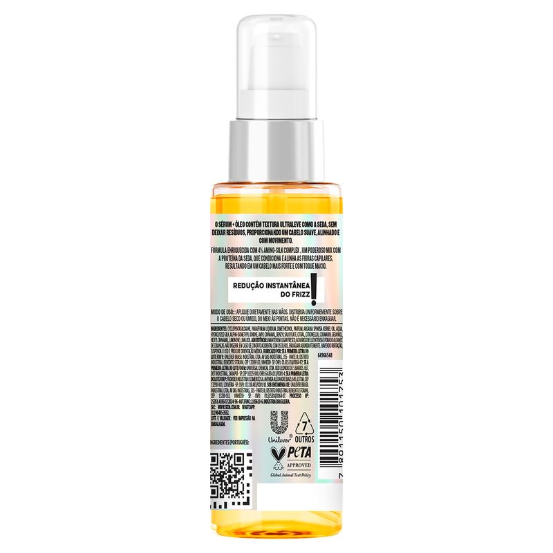 Desenvolvido com tecnologia de ponta, o Sérum + Óleo Seda combina o poder dos óleos nutritivos com a leveza do sérum, garantindo que seus cabelos fiquem livres de frizz e com um toque sedoso. A aplicação é simples e rápida, permitindo que você incorpore este tratamento na sua rotina de cuidados capilares sem complicações.
